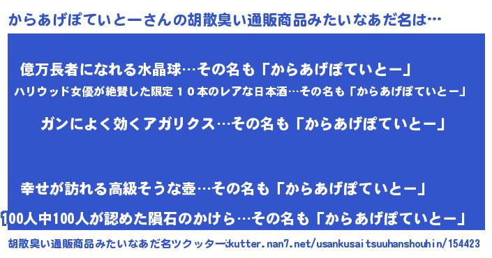 | 意味不明あだ名 | 『自称からあげぽていとー』 |