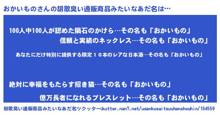 | 男性向けラノベタイトル風あだ名 | 『この素晴らしい世界におかいものを!』 |