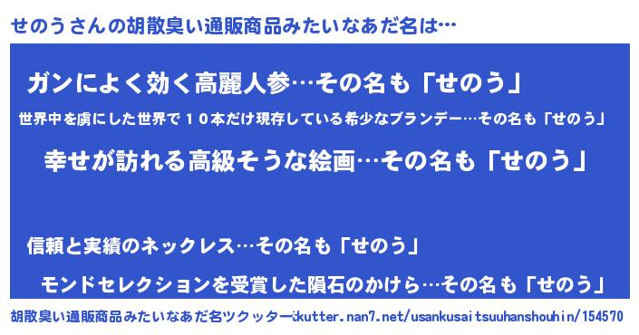 | 意味不明あだ名 | 『めかぶ科せのう属』『自称せのう』 |