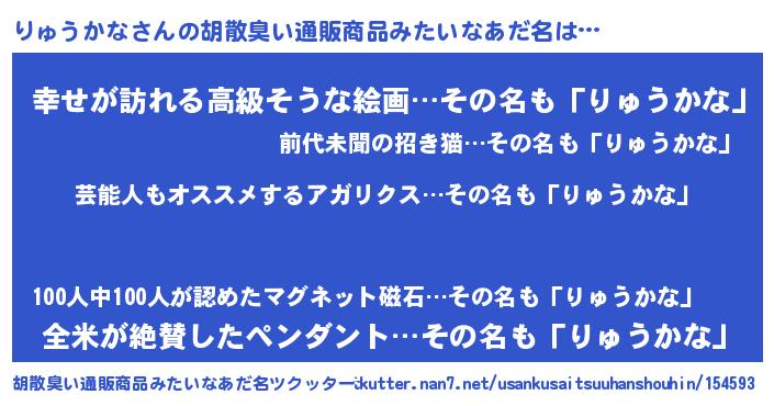 | 男性向けラノベタイトル風あだ名 | 『Re:りゅうかなから始める異世界生活』 |