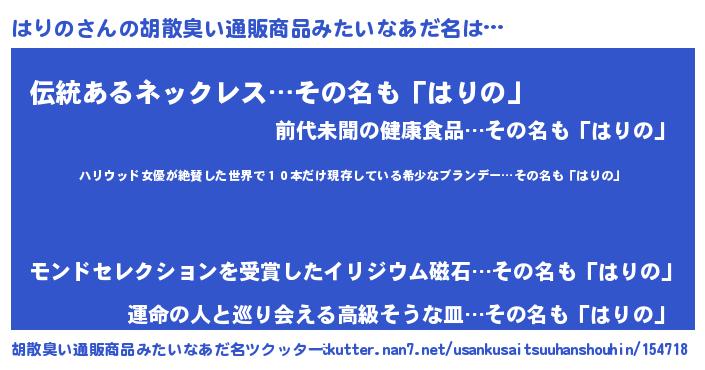 | 意味不明あだ名 | 『住所不定無職はりの(77歳)』 |