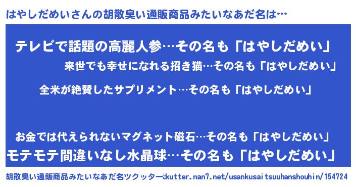 | 男性向けラノベタイトル風あだ名 | 『はやしだめい~年齢イコール彼女いない歴の魔法使い~』 |