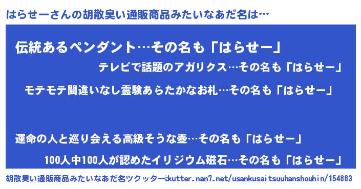 | 男性向けラノベタイトル風あだ名 | 『転生したらはらせーだった件』 |