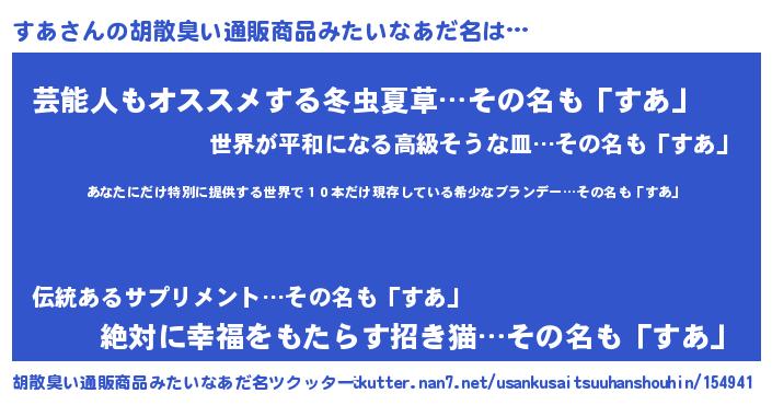 | 意味不明あだ名 | 『住所不定無職すあ(85歳)』『自称すあ』 |