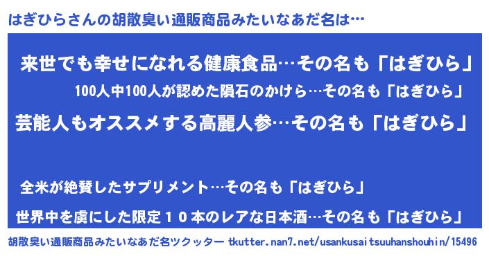 | ヘコむあだ名 | 『はぎひら(小並感)』『はぎ太郎』 |
