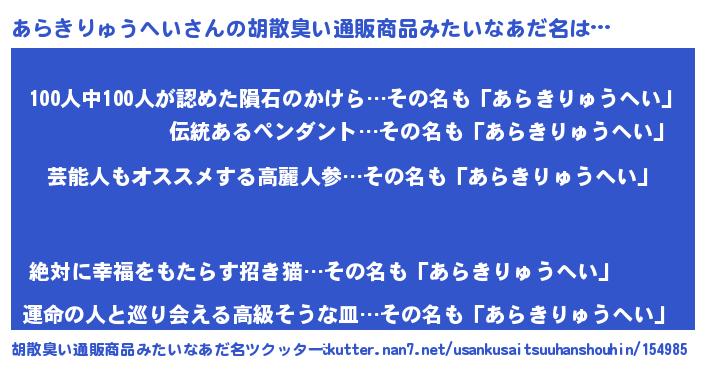 | 男性向けラノベタイトル風あだ名 | 『Re:あらきりゅうへいから始める異世界生活』 |