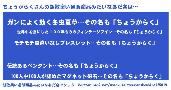| 肩書あだ名 | 『ちょうからく社長』『ちょうからく総統』 |