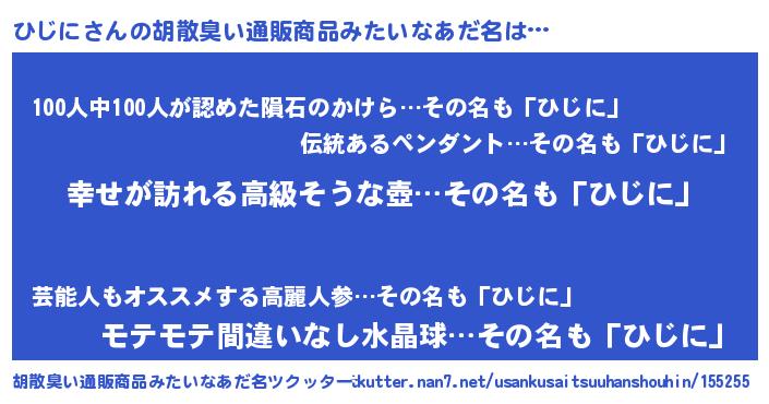 | 男性向けラノベタイトル風あだ名 | 『やはりひじにの青春ラブコメはまちがっている 』 |