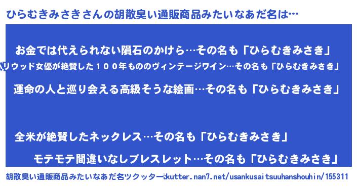 | 男性向けラノベタイトル風あだ名 | 『うちのひらむきみさきが世界を掌握している!』 |