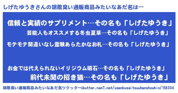 | 恥ずかしいあだ名 | 『プリティーしげたゆうき』『しげちん』 |