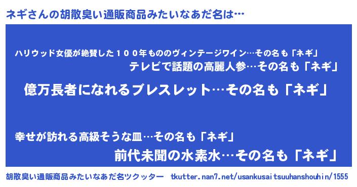 | 男性向けラノベタイトル風あだ名 | 『ネギに滅ぼされるだけの簡単なお仕事です』 |