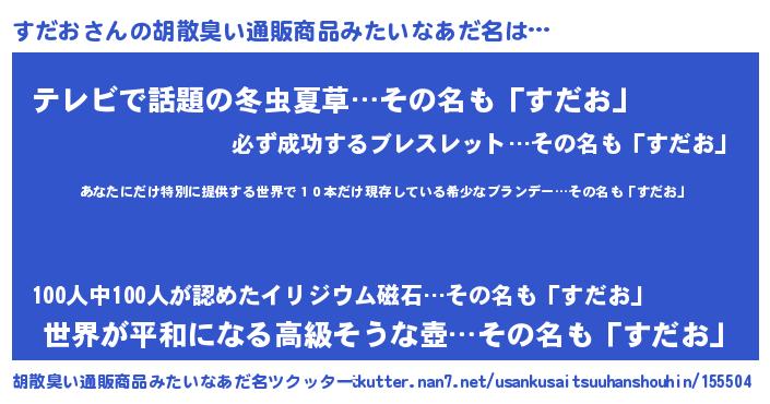 | 男性向けラノベタイトル風あだ名 | 『すだおに滅ぼされるだけの簡単なお仕事です』 |