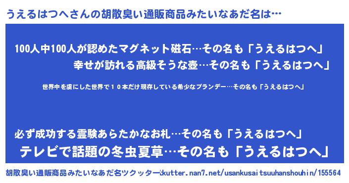 | 意味不明あだ名 | 『住所不定無職うえるはつへ(74歳)』 |