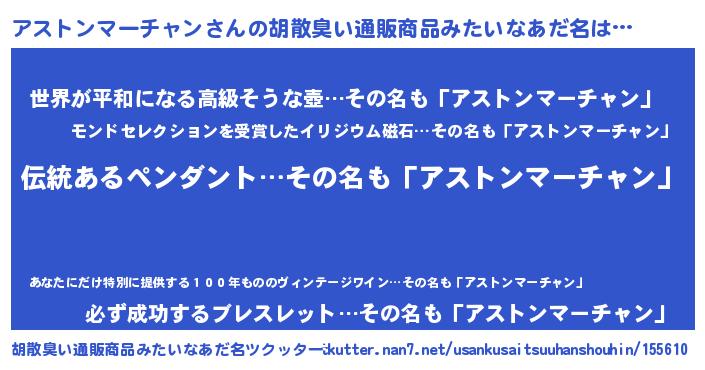 | 意味不明あだ名 | 『とにかく怪しいアストンマーチャン』 |