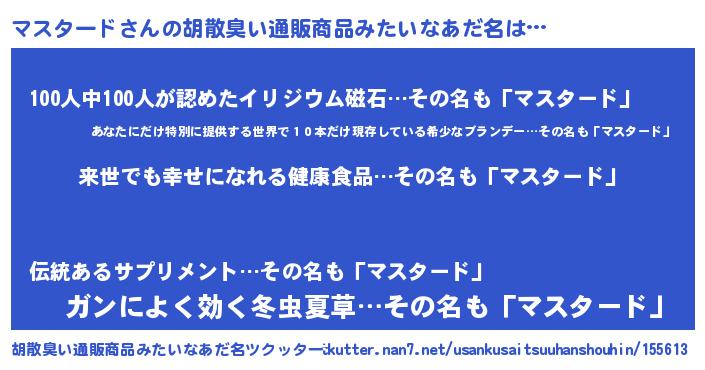 | 男性向けラノベタイトル風あだ名 | 『マスタードに滅ぼされるだけの簡単なお仕事です』 |