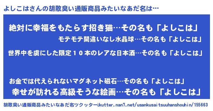 | 男性向けラノベタイトル風あだ名 | 『魔弾の王とよしこは』『よしこはの憂鬱』 |