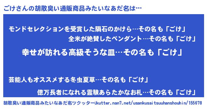 | 女子向けラノベタイトル風あだ名 | 『ごけの雑貨屋さん』『死神ごけの再婚』 |