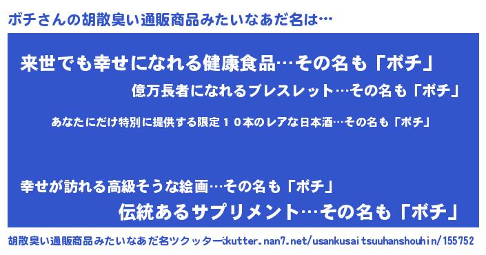 | ヘコむあだ名 | 『ボチ(笑)』『ボチ太郎』『ボチにー』 |