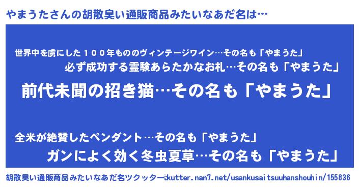 | 男性向けラノベタイトル風あだ名 | 『やまうた~年齢イコール彼女いない歴の魔法使い~』 |