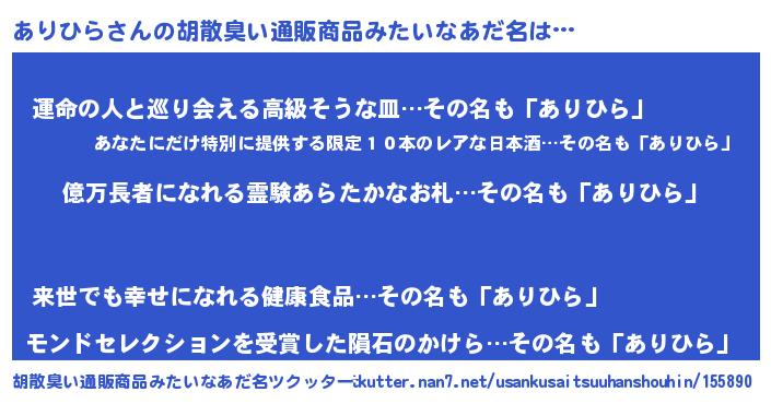 | 意味不明あだ名 | 『ペロリンありひら』『永久保存ありひら』 |
