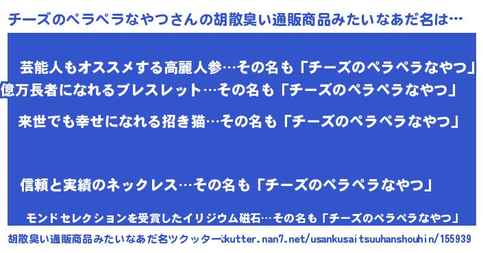 | ヘコむあだ名 | 『チーズのペラペラなやつ(小並感)』 |