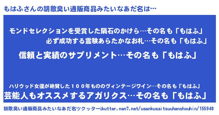 | 意味不明あだ名 | 『とにかく怪しいもはふ』『自称もはふ』 |