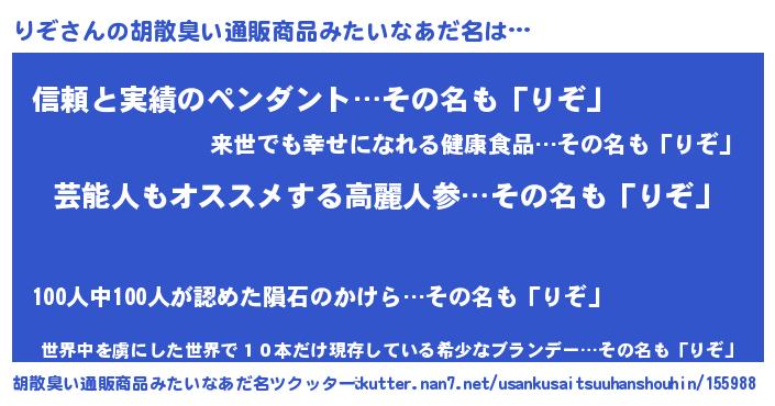 | ヘコむあだ名 | 『りぞ太郎』『りぞ(遠い目)』『豆乳』 |