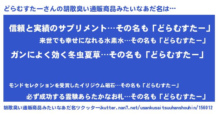 | 男性向けラノベタイトル風あだ名 | 『ドラムスタースレイヤー』 |
