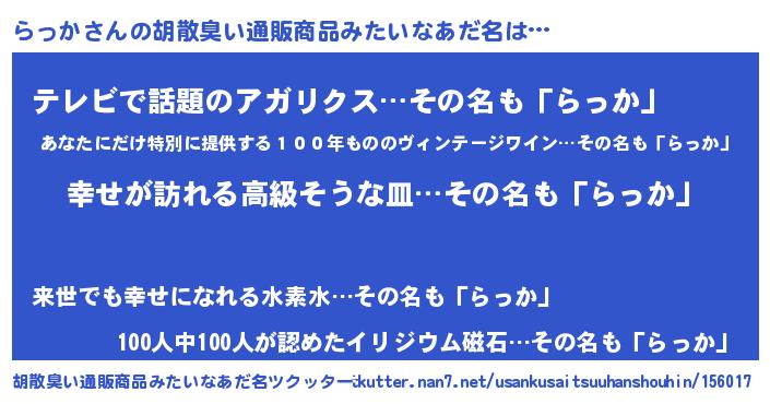 | 男性向けラノベタイトル風あだ名 | 『やはりらっかの青春ラブコメはまちがっている 』 |