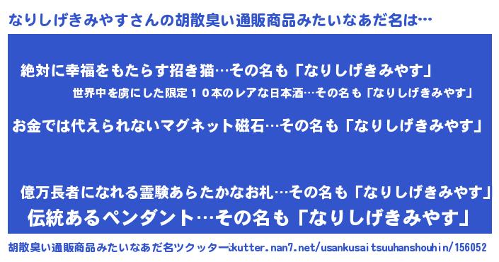 | ヘコむあだ名 | 『なりしげきみやす(笑)』『なりお』 |
