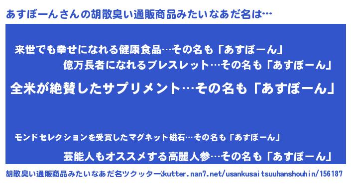 | 男性向けラノベタイトル風あだ名 | 『あすぼーん~年齢イコール彼女いない歴の魔法使い~』 |