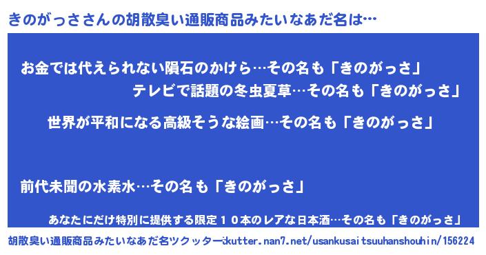 | 男性向けラノベタイトル風あだ名 | 『転生したらきのがっさだった件』 |
