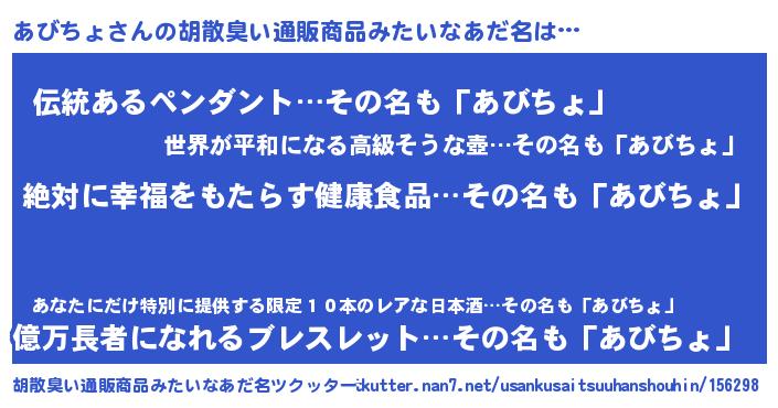 | 意味不明あだ名 | 『永久保存あびちょ』『ペロリンあびちょ』 |