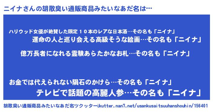 | 男性向けラノベタイトル風あだ名 | 『うちのニイナが世界を掌握している!』 |