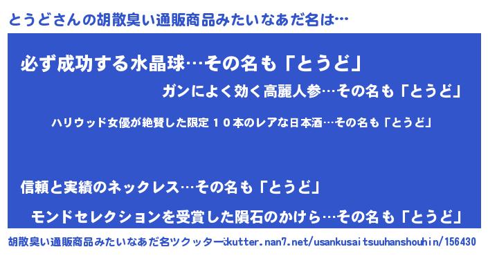 | 意味不明あだ名 | 『住所不定無職とうど(41歳)』『自称とうど』 |