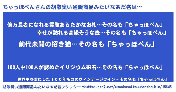 | ヘコむあだ名 | 『ちゃっほぺん(小並感)』『ちゃもー』 |