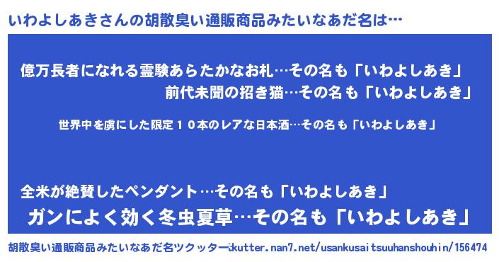 | 意味不明あだ名 | 『住所不定無職いわよしあき(62歳)』 |