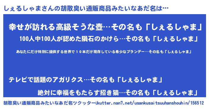 | 男性向けラノベタイトル風あだ名 | 『しぇるしゃま~年齢イコール彼女いない歴の魔法使い~』 |