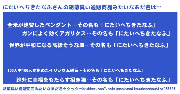 | 男性向けラノベタイトル風あだ名 | 『にたいへちきたなふに滅ぼされるだけの簡単なお仕事です』 |