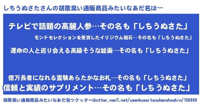 | 男性向けラノベタイトル風あだ名 | 『しちうぬさた~年齢イコール彼女いない歴の魔法使い~』 |