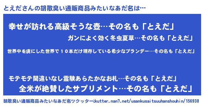 | ヘコむあだ名 | 『豆乳』『とえ太郎』『とえにー』 |