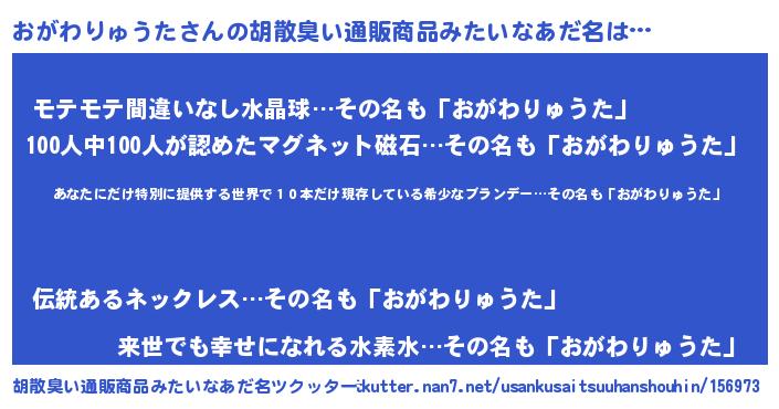 | 意味不明あだ名 | 『住所不定無職おがわりゅうた(74歳)』 |