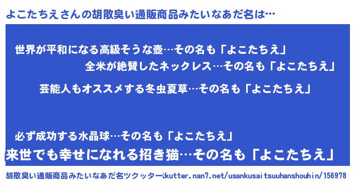 | 男性向けラノベタイトル風あだ名 | 『Re:よこたちえから始める異世界生活』 |