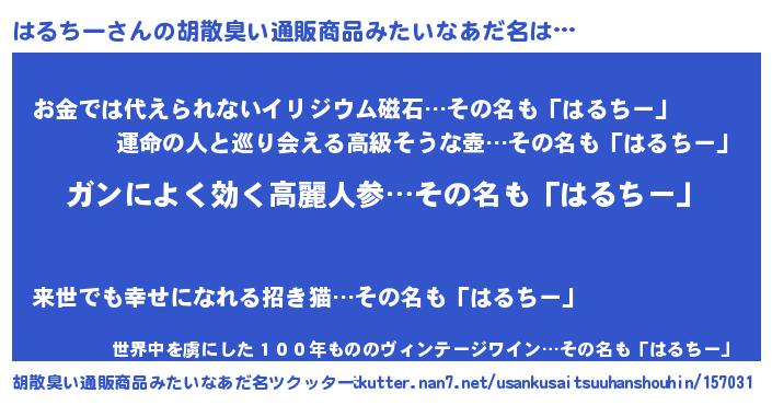 | 男性向けラノベタイトル風あだ名 | 『緋弾のハルチー』『魔弾の王とはるちー』 |
