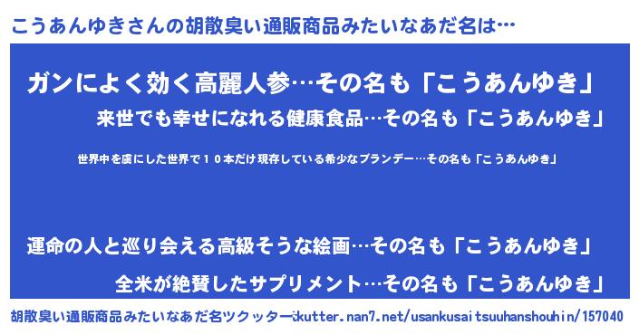 | 意味不明あだ名 | 『住所不定無職こうあんゆき(89歳)』 |
