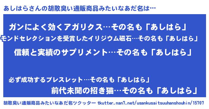 | ヘコむあだ名 | 『あしを』『あしはら(笑)』『つくし』 |