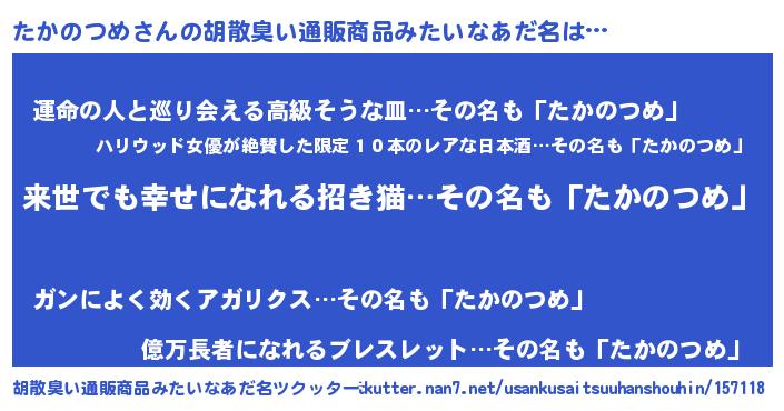 | 意味不明あだ名 | 『永久保存たかのつめ』『自称たかのつめ』 |