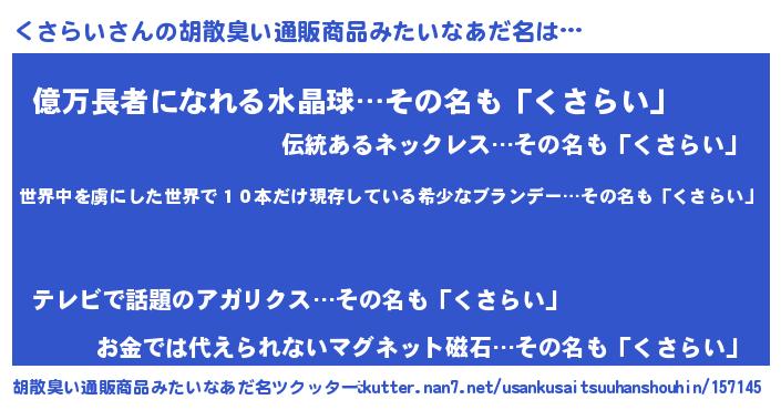 | 男性向けラノベタイトル風あだ名 | 『この素晴らしい世界にくさらいを!』 |