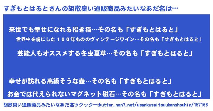 | 女子向けラノベタイトル風あだ名 | 『すぎもとはるとストレイドッグス』 |