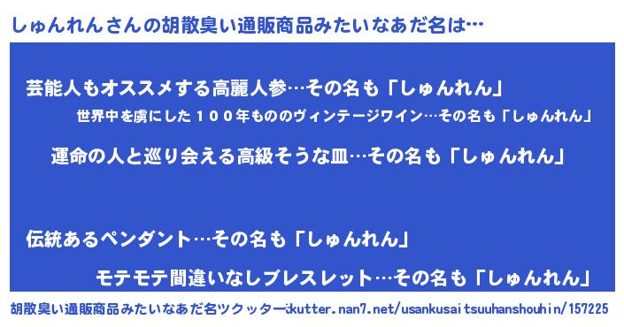 | ヘコむあだ名 | 『酢こんぶ』『しゅにー』『しゅ太郎』 |